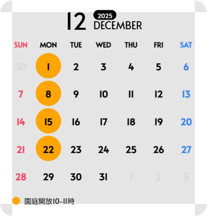 お知らせ 2025.12.01 つつじ野保育園 つつじ野保育園の12月の園庭開放日 2025年12月のつつじ野保育園の園庭開放日をお知らせいたします。 【実施日】 12月1日(月) 12月8日(月) 12月15日(月) 12月22日(月) 【実施場所】 加古川市平岡町つつじ野3-1 つつじ野保育園 【時間】 10:00~11:00 【対象】 0~3歳児の乳幼児とその付き添いの保護者様 前の記事 お知らせ一覧