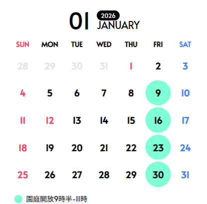 お知らせ 2026.01.06 東加古川保育園 東加古川保育園の1月の園庭開放日 2026年1月の東加古川保育園の園庭開放日をお知らせいたします。 【実施日】 1月9日(金) 1月16日(金) 1月23日(金) 1月30日(金) 【実施場所】 加古川市平岡町新在家184番地の1 東加古川保育園 【時間】 9:30~11:00 【対象】 0~3歳児の乳幼児とその付き添いの保護者様 前の記事 お知らせ一覧 次の記事