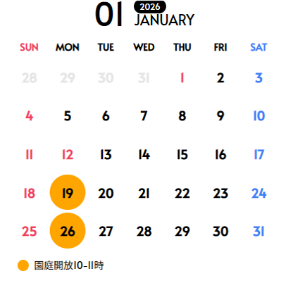 お知らせ 2026.01.06 つつじ野保育園 つつじ野保育園の1月の園庭開放日 2026年1月のつつじ野保育園の園庭開放日をお知らせいたします。 【実施日】 1月19日(月) 1月26日(月) 【実施場所】 加古川市平岡町つつじ野3-1 つつじ野保育園 【時間】 10:00~11:00 【対象】 0~3歳児の乳幼児とその付き添いの保護者様 前の記事 お知らせ一覧