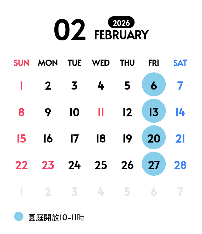 お知らせ 2026.01.30 平岡南保育園 平岡南保育園の2月の園庭開放日 2026年2月の平岡南保育園の園庭開放日をお知らせいたします。 【実施日】 2月6日(金) 2月13日(金) 2月20日(金) 2月27日(金) 【実施場所】 兵庫県加古川市平岡町一色東2丁目57番地 平岡南保育園 【時間】 10:00~11:00 【対象】 0~3歳児の乳幼児とその付き添いの保護者様 前の記事 お知らせ一覧 次の記事