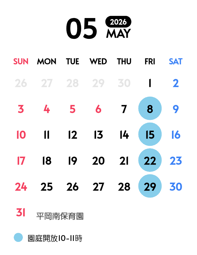 お知らせ 2026.04.27 平岡南保育園 平岡南保育園の5月の園庭開放日 2026年5月の平岡南保育園の園庭開放日をお知らせいたします。 【実施日】 5月8日(金) 5月15日(金) 5月22日(金) 5月29日(金) 【実施場所】 兵庫県加古川市平岡町一色東2丁目57番地 平岡南保育園 【時間】 10:00~11:00 【対象】 0~3歳児の乳幼児とその付き添いの保護者様 前の記事 お知らせ一覧 次の記事